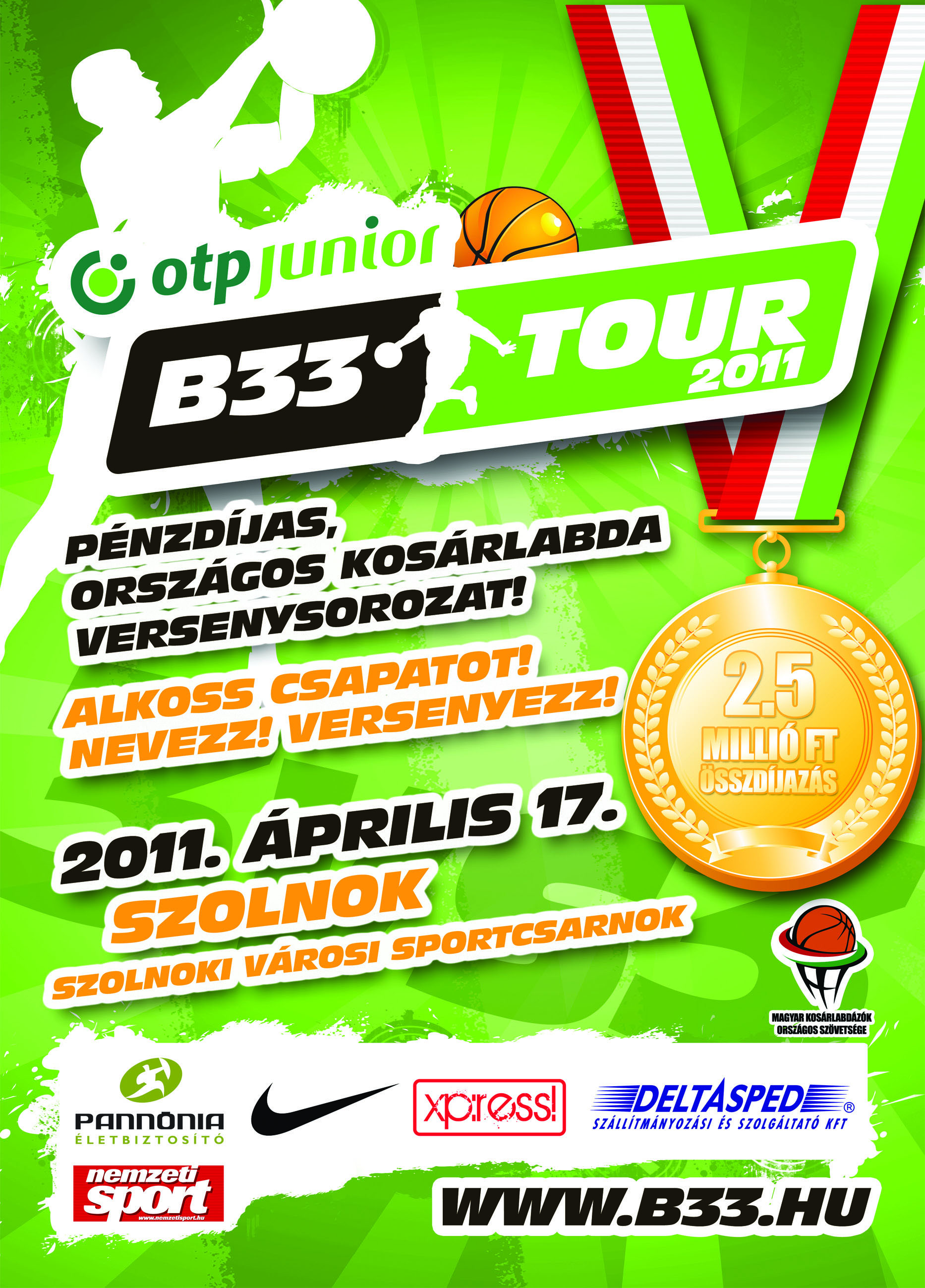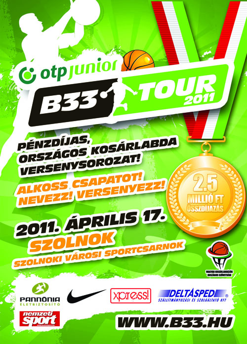 A Magyar Kosárlabdázók Országos Szövetsége és a Jász-Nagykun-Szolnok Megyei Kosárlabda Szövetség közös szervezésében 2011. május 14.-én Szolnokon, a Véső úti Sportcsarnokban rendezzük meg a B33 középiskolás bajnokságot, melynek egyik legfőbb eleme a sportág népszerűsítése. Sokak előtt közismert, hogy hazánkban is elindult már e játék versenysorozata, mely rövid idő alatt is népszerűvé vált. Az MKOSZ új programjához kapcsolódóan, amely kimondja, be kell vinni a sportágat az iskolákba, született a gondolat, hogy első lépcsőben a középiskolások számára szerveződjön e bajnokság. Fontos tudni, hogy ezen a napon az ország többi megyéjében is hasonló tornákat rendeznek, cél, hogy minél több tanuló kapcsolódjon be a sorozatba!